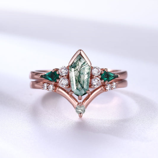 Unique Moss Agate Wedding Ring Set Rose Gold Gothic Engagement Ring Coffin Shield Cut
