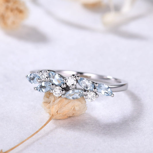 Marquise Aquamarine Moissanite 14k White Gold Ring Vintage Blue Gemstone Wedding Band