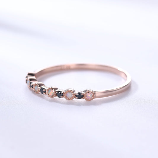 Opal Black Onyx Wedding Band 14k Rose Gold Stackable Milgrain Ring for Her