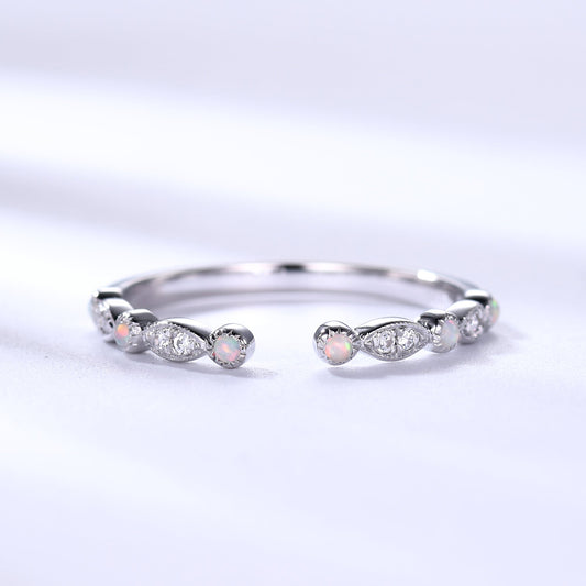 Art Deco Opal Diamond Wedding Band 14k 18k White Gold Unique Open Cuff Bridal Ring