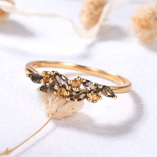 Unique Smoky Quartz Citrine Wedding Band Vintage Brown Gemstone Yellow Gold Ring